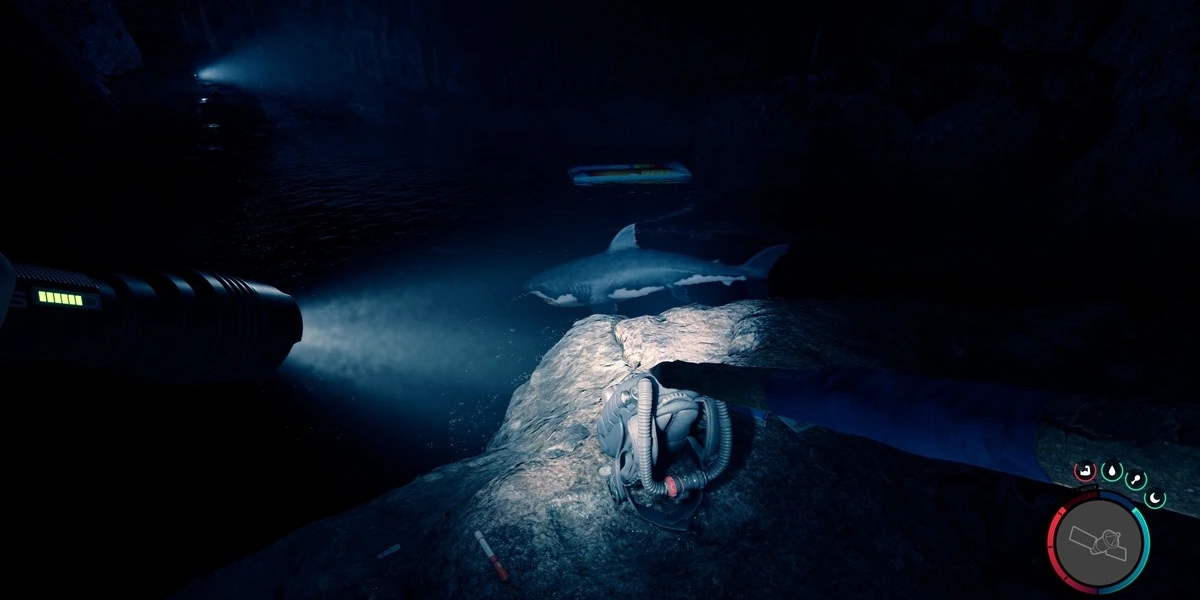 - Par exemple, lorsque vous entrez dans une caverne et que vous vous dirigez vers les profondeurs pour récupérer le recycleur (comme le montre l’image ci-contre). Vous pouvez avancer prudemment en marchant sur la terre ferme, ramasser le recycleur, puis attendre que le requin passe pour plonger et nager jusqu’à la sortie du tunnel. Vous pouvez également tenter de le poignarder avec la Lance artisanale, mais cela m’a semblé un peu maladroit et j’ai fini par éviter la créature lorsque j’ai plongé.