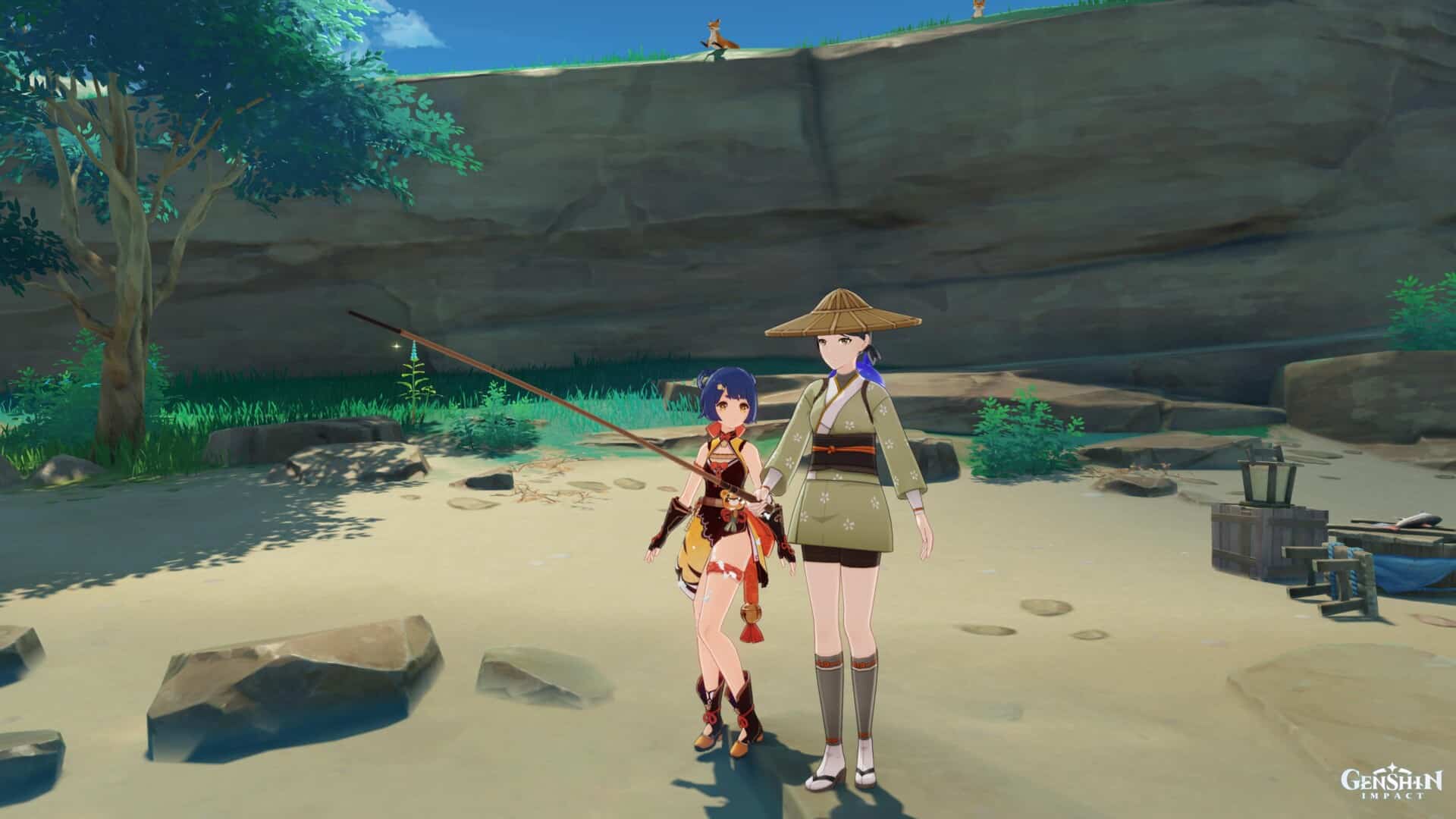 Pour faire entrer l’arme d’hast The Catch Genshin Impact, nous devrons aller à Inazuma City. Plus précisément, c’est le point de déplacement rapide juste au nord-est de la périphérie de la ville. Ici, vous trouverez un vendeur de pêche nommé Kujirai Momiji. Elle vend les articles suivants :
