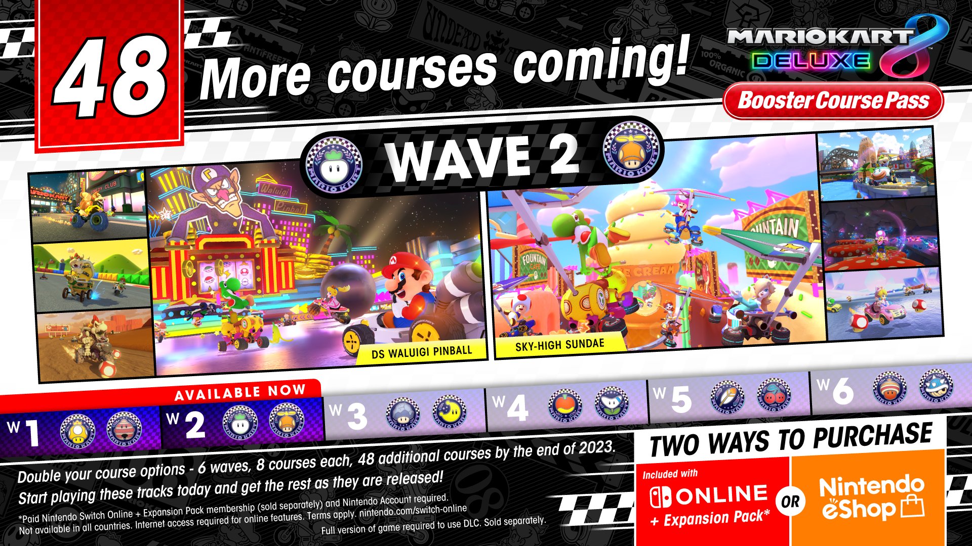 Le moment est enfin arrivé puisque la deuxième vague de parcours téléchargeables dans Mario Kart 8 Deluxe est désormais en ligne. Vous pouvez accéder aux circuits supplémentaires en achetant le Booster Course Pass de Mario Kart 8 Deluxe via le Nintendo eShop ou en vous abonnant au Nintendo Switch Online + Expansion Pack. Si le Booster Course Pass est déjà installé sur votre console Switch, il vous suffit de mettre à jour votre jeu, ce qui devrait se faire automatiquement. Vous pouvez également déclencher un téléchargement en passant la souris sur l’icône de Mario Kart 8 Deluxe, en appuyant sur le bouton + et en sélectionnant Vérifier le téléchargement. Les huit derniers parcours sur lesquels vous pouvez courir sont les suivants :