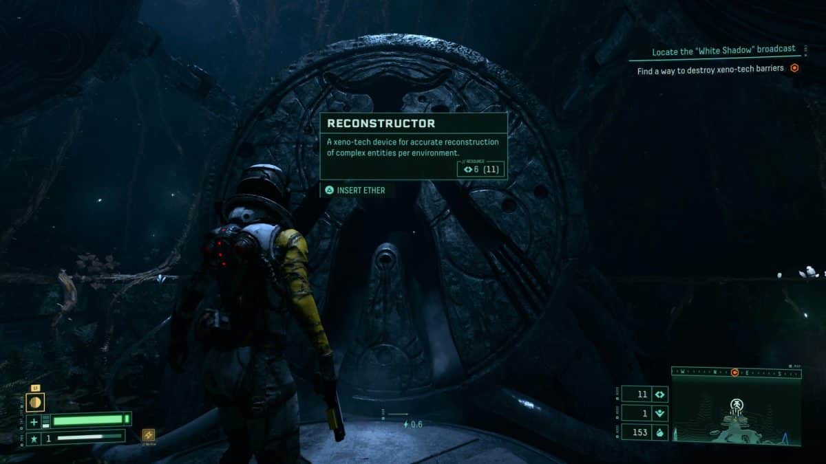 L’utilisation de ce dispositif est comme une ancre ou un point de sauvegarde, puisque le jeu n’a pas de système de sauvegarde traditionnel, donc à partir de ce point, si vous mourez, vous ne respawn pas au début du jeu, mais au dernier Reconstructeur que vous avez utilisé. Vous perdrez également tout dysfonctionnement ou parasite lorsque vous retournerez dans le biome où se trouve le Reconstructeur.